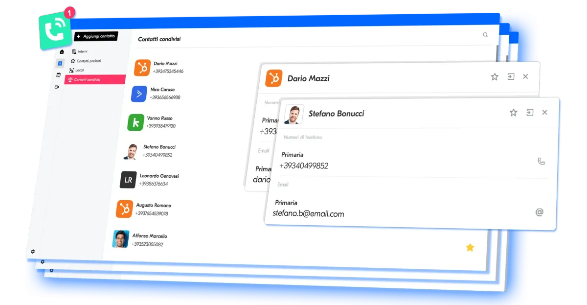 Questa funzionalità consente di condividere i contatti della tua rubrica a chiunque abbia accesso al centralino, ovunque ci si trovi (da app desktop e telefoni VoIP).