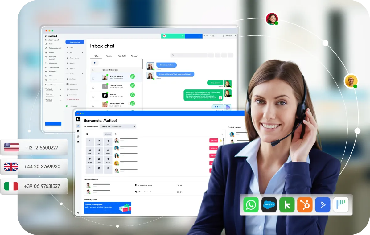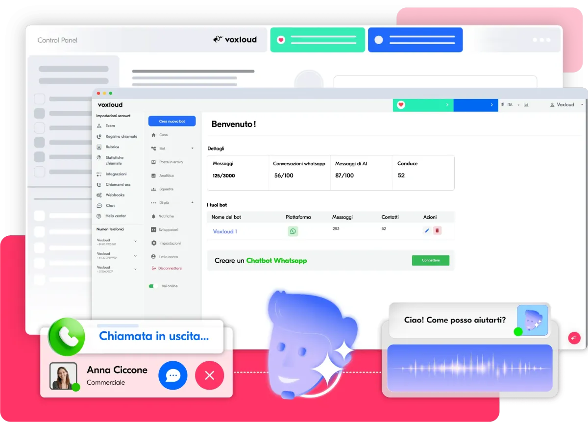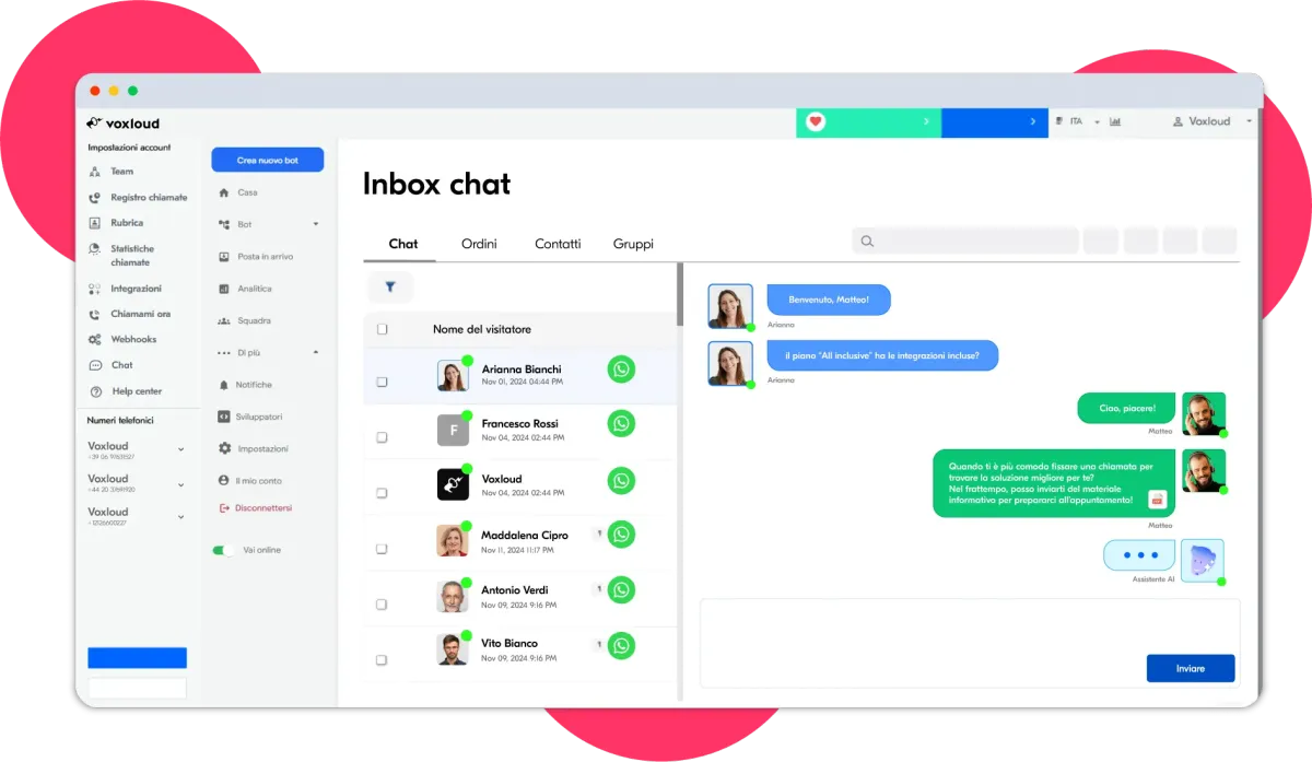 Indipendentemente dal tuo settore, il modulo chat di Voxloud ti consentirà di accentrare in un unico posto i tuoi numeri WhatsApp Business e tutte le chat dei tuoi social ma ti permetterà anche di gestire ogni messaggio o lasciare che sia l’AI a farlo al posto tuo, qualificando, conversando e fissando appuntamenti in automatico, 24 ore su 24.