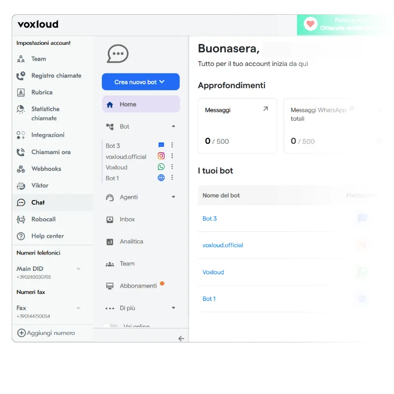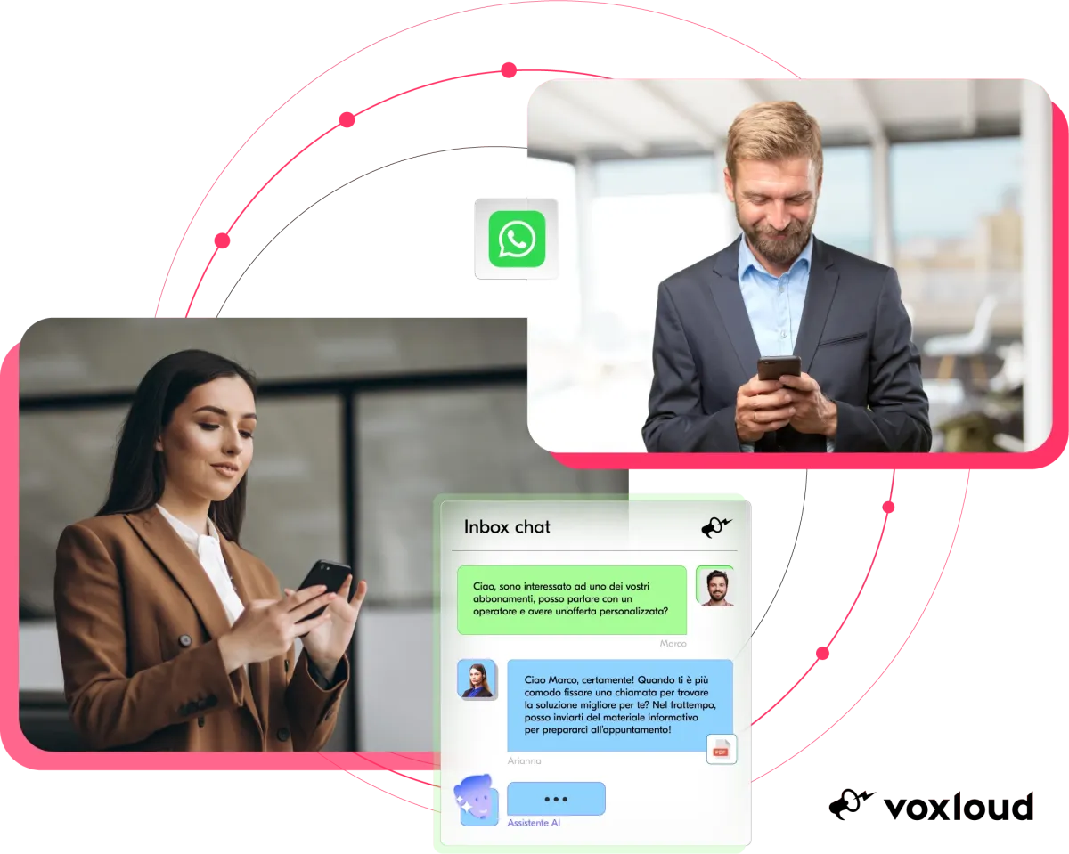 Se nella tua azienda gestisci un gran numero di lead e hai un flusso costante di messaggi 24 ore su 24 ma non riesci a rispondere velocemente e puntualmente a ogni richiesta (commerciale o di supporto), allora il modulo chat di Voxloud fa proprio al caso tuo: ti consentirà di accentrare in un unico posto i tuoi numeri WhatsApp Business e tutte le chat dei tuoi social ma ti permetterà anche di gestire ogni messaggio o lasciare che sia l’AI a farlo al posto tuo, qualificando, conversando e fissando appuntamenti in automatico, 24 ore su 24.