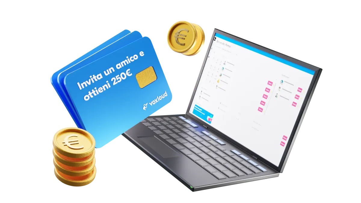 Passaci il suo contatto: se diventerà cliente Voxloud, tu riceverai una gift card da 250€ e il tuo amico riceverà 250€ in gift card o crediti Voxloud!