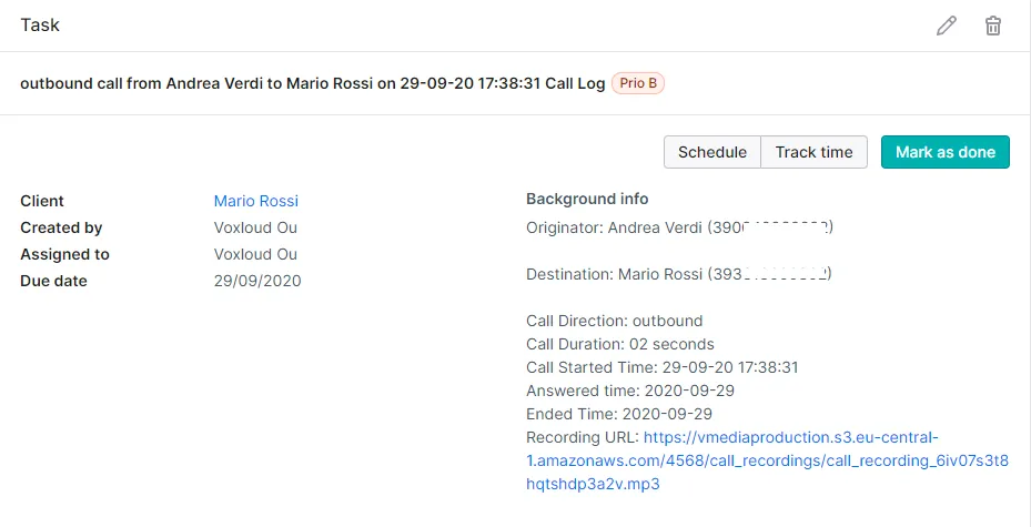 Dai dettagli dell’attività potrai accedere facilmente alla registrazione delle chiamate con un click