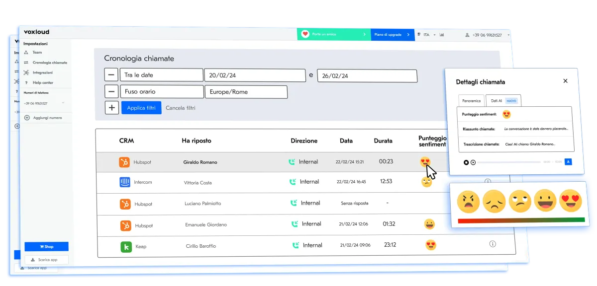 Analizza lo stato emotivo del cliente durante la conversazione direttamente nella cronologia chiamate per dare la giusta priorità agli interventi.