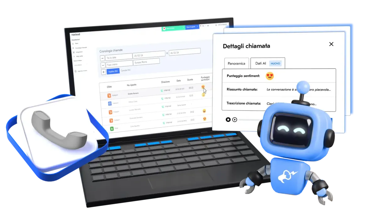 Ricevi un’analisi precisa del sentiment della conversazione, un riassunto conciso e una trascrizione completa della chiamata grazie all’intelligenza artificiale integrata in Voxloud.
